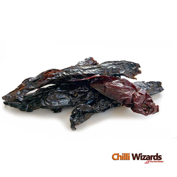 The pasilla chilli also known as the chilli negro is the dried form of the Mexican chilaca chilli pepper, a long and narrow member of the species Capsicum annuum. It's so named for its dark, wrinkled skin and in Mexican is pronounced pah-SEE-yah (literally "little raisin"), it is of a mild to medium-hot, rich-flavoured chilli. As dried, it is generally 6 to 8 in (15 to 20 cm) long and 1.0 to 1.5 in (2.5 to 4 cm) in diameter.